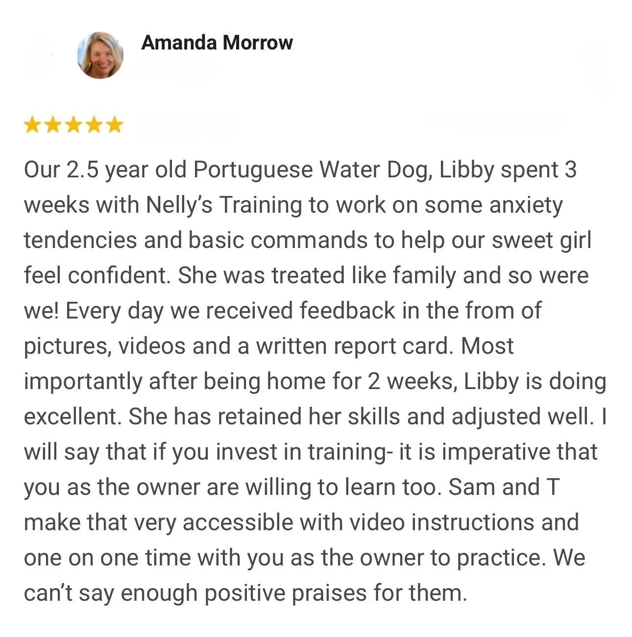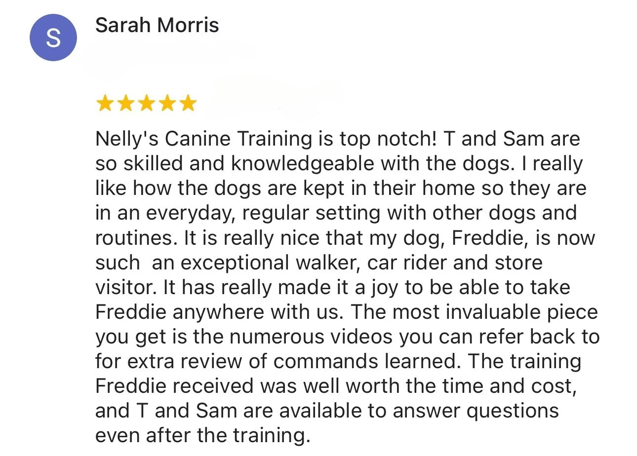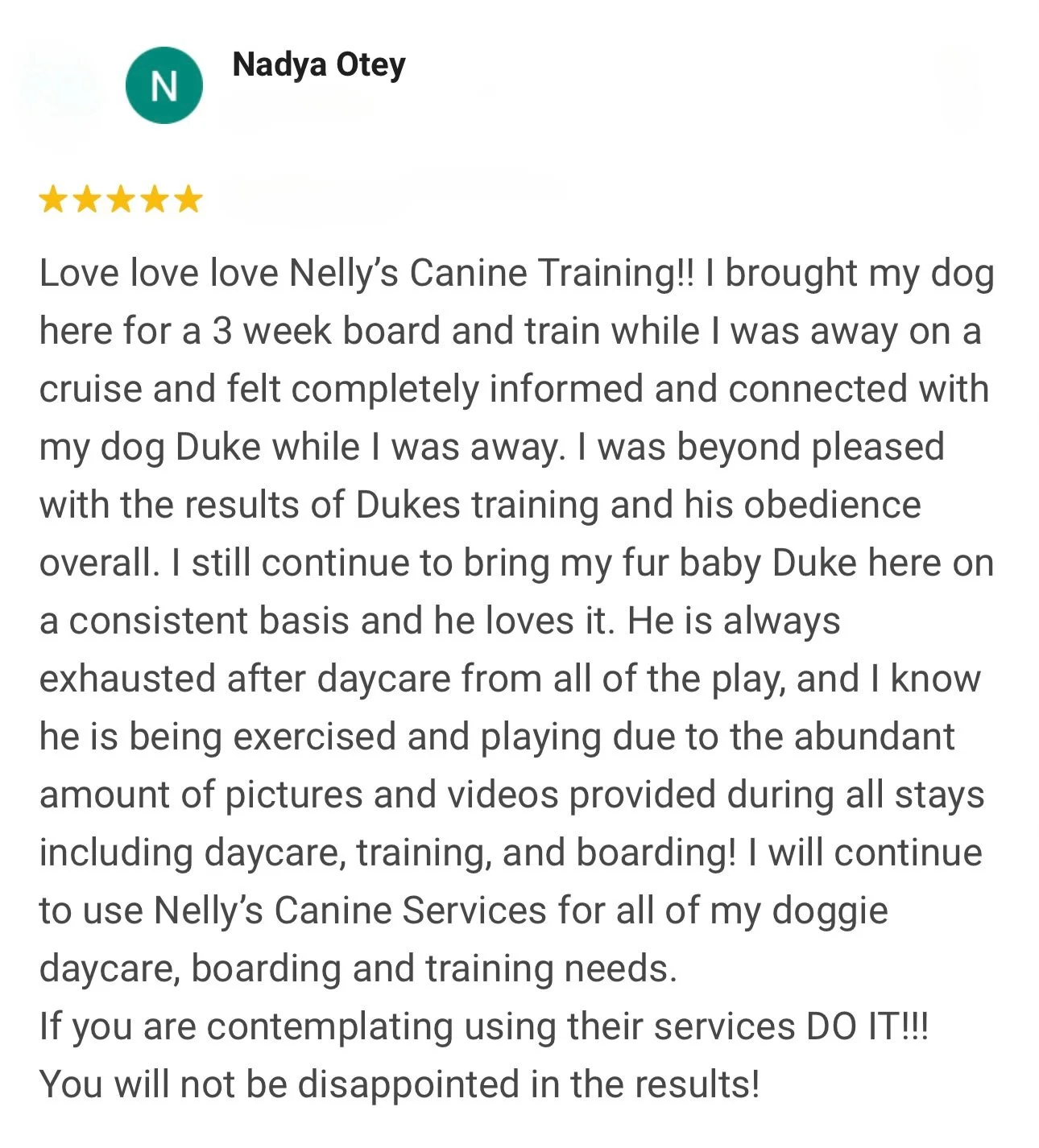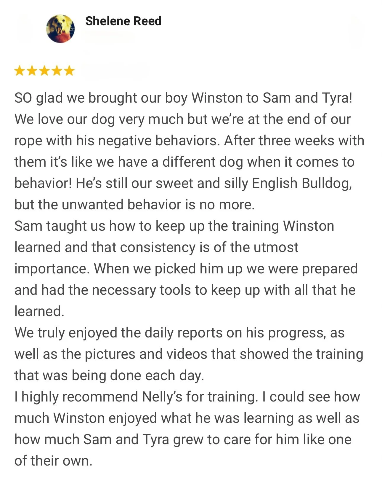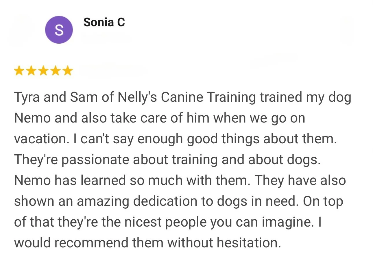 “Tyra and Sam of Nelly’s Canine Training trained my dog Nemo and also take care of him when we go on vacation. I can’t say enough good things about them.”