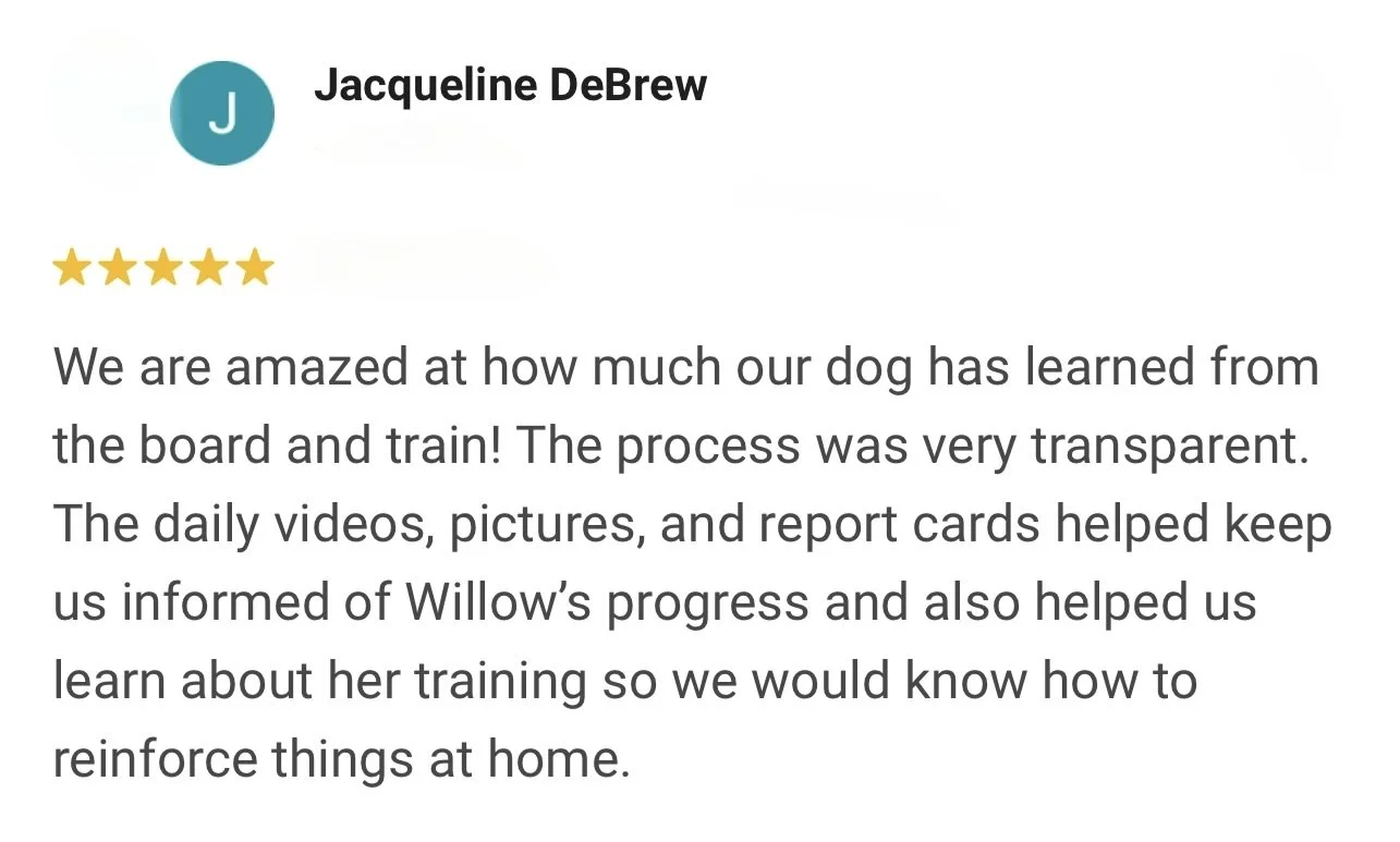 “We are amazed at how much our dog has learned from the board and train! The process was very transparent.”