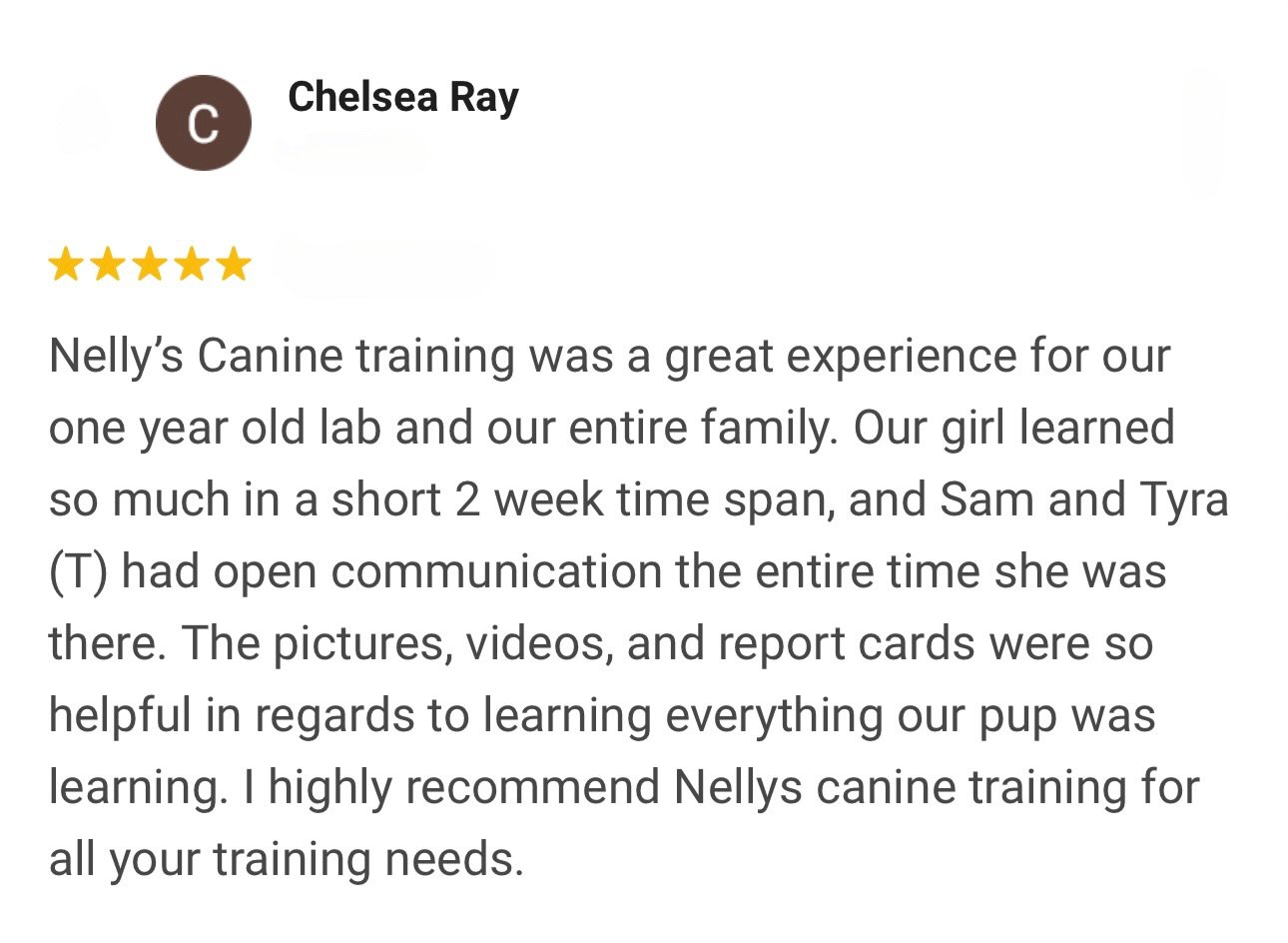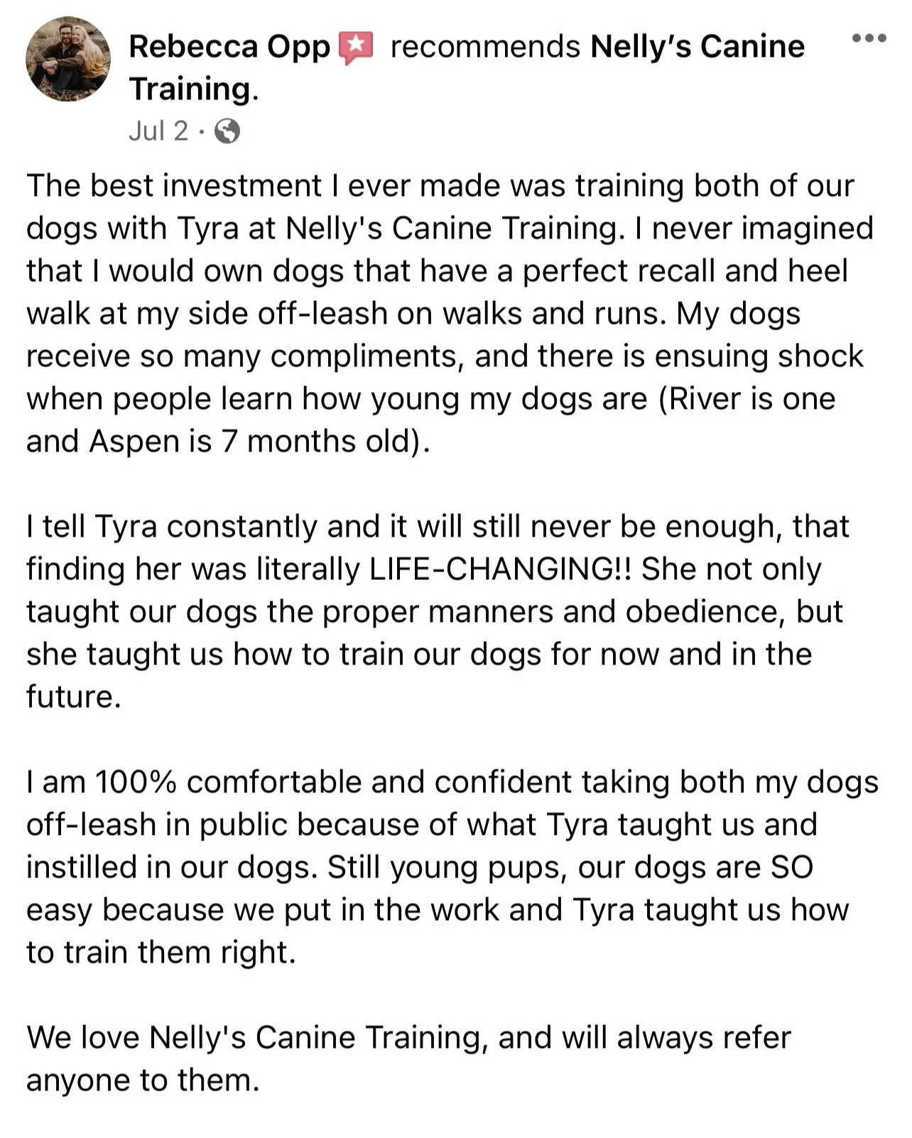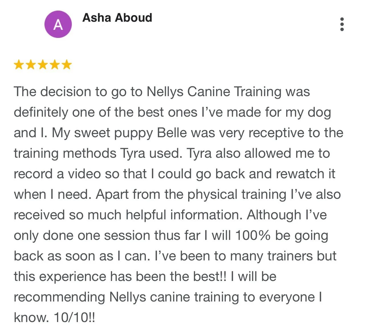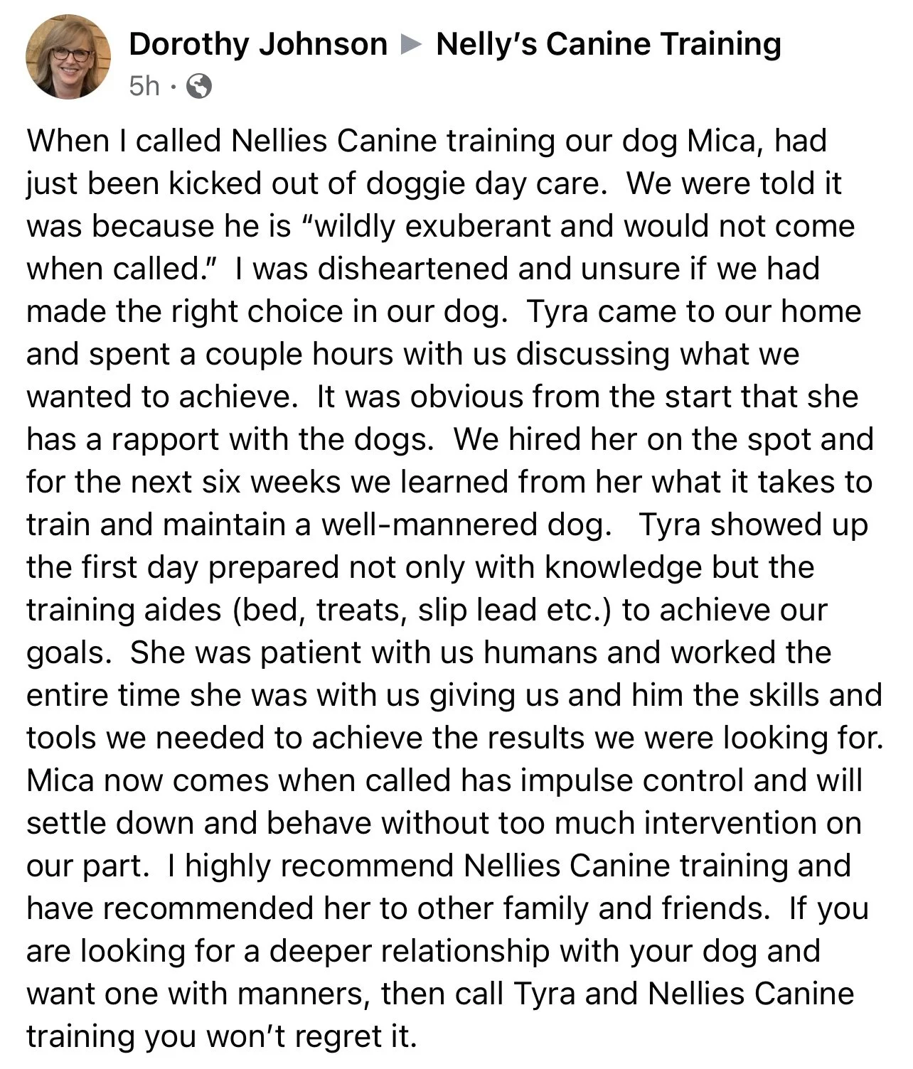 “If you are looking for a deeper relationship with your dog and want one with manners, then call Tyra and Nelly’s Canine training you won’t regret it.”