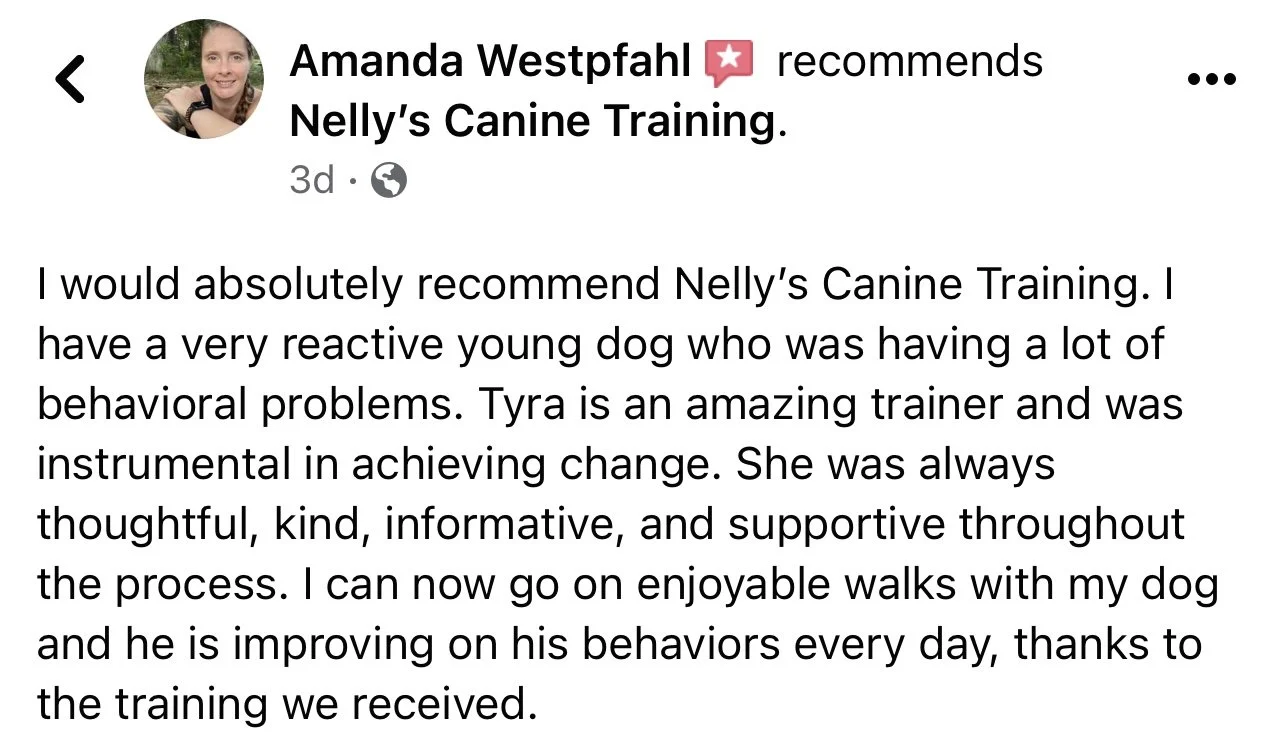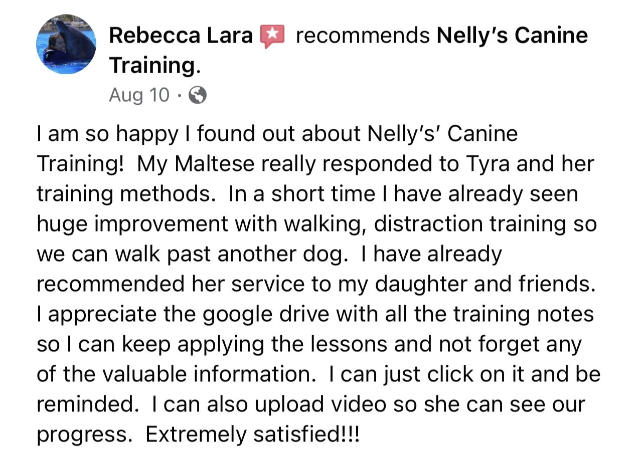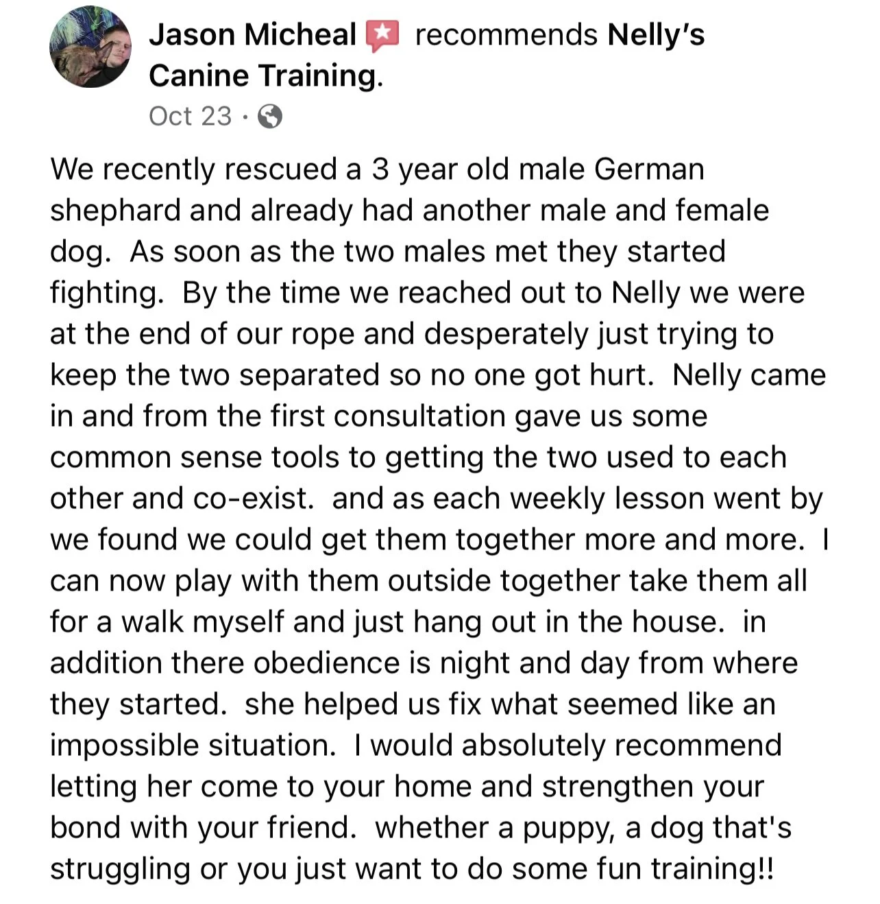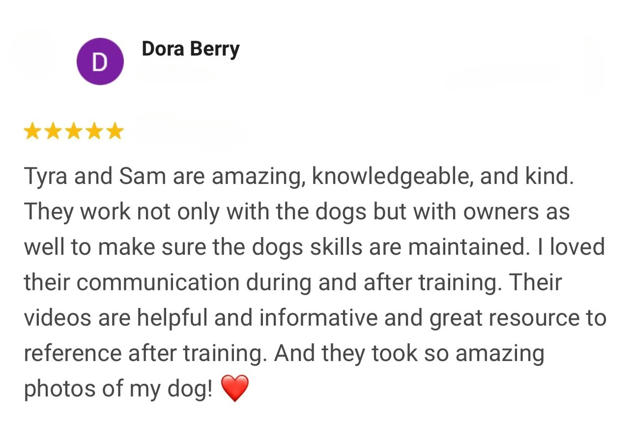 “If you are looking for a deeper relationship with your dog and want one with manners, then call Tyra and Nelly’s Canine training you won’t regret it.”