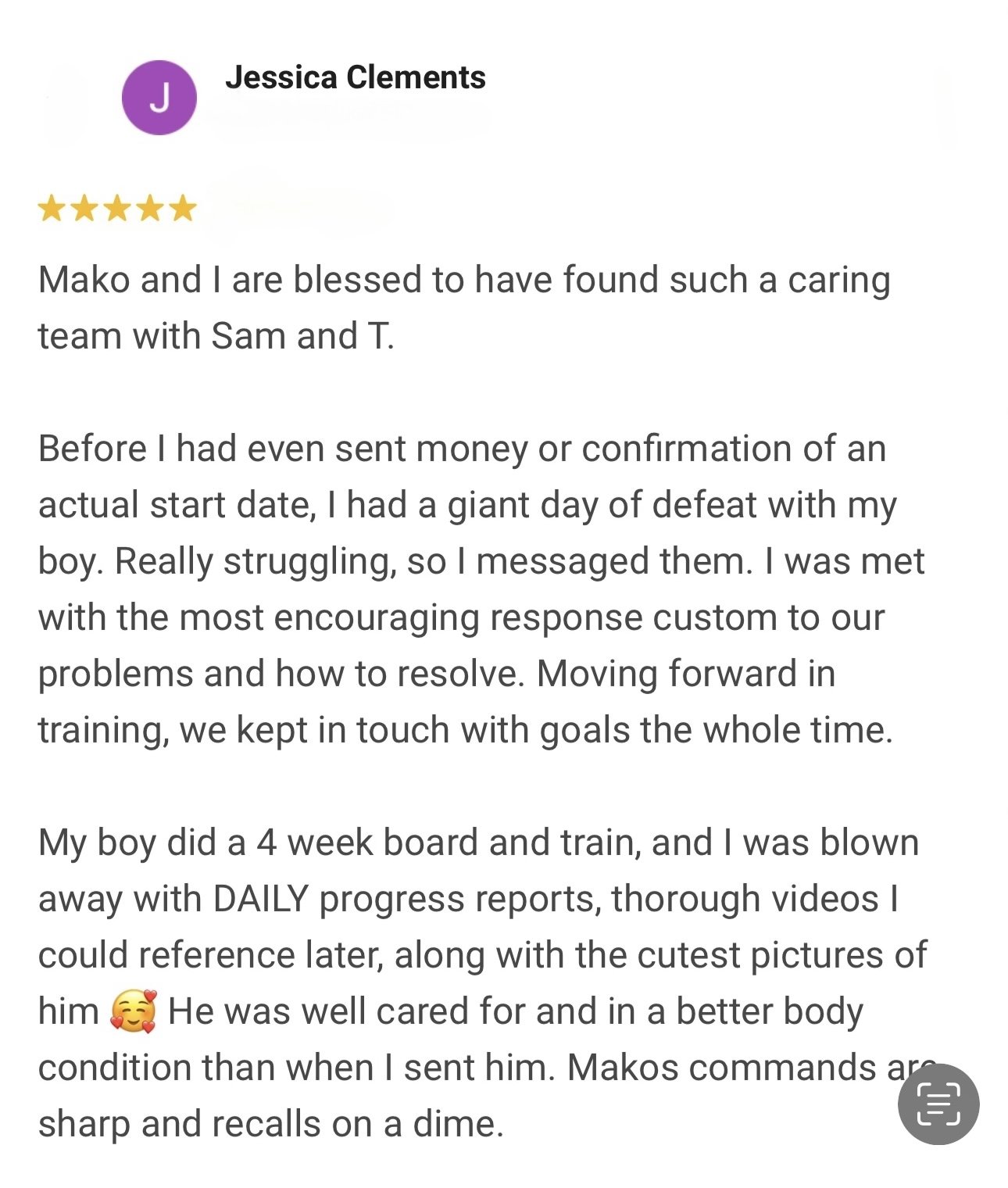 “I sent my 4 month old German Shepherd for a week long board and train, and came back so impressed with the progress she made in such a short time. She is already ten times more attentive and listens so well.”